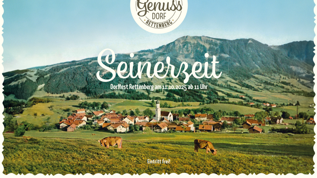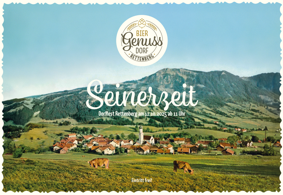 Am 11. Oktober 2025 ist es endlich wieder soweit: Die ganze Gemeinde reist in seine Vergangenheit zurück. In und rund um das Rettenberger Kurgärtle findet die Zeitreise von „Elf bis Elf Uhr“ statt. Unter dem Motto „Seinerzeit im Bier.Genuss.Dorf Rettenberg“ möchten wir Sie wieder gerne im Namen aller Vereine und „Mitmacher“ einladen, mit uns das „Dorfleben anno dazumal“ zu erleben.